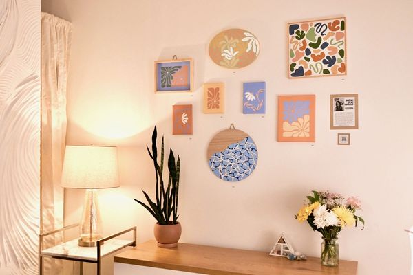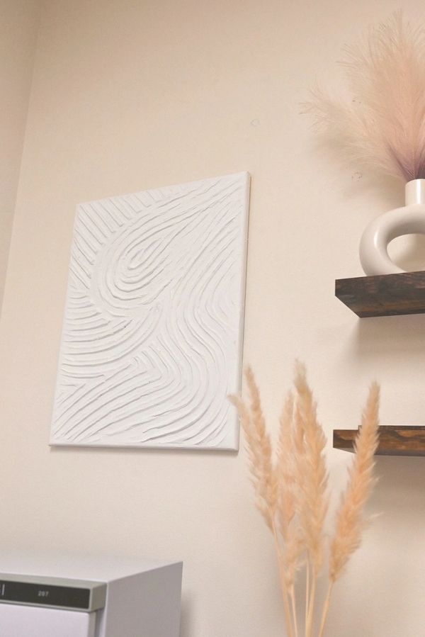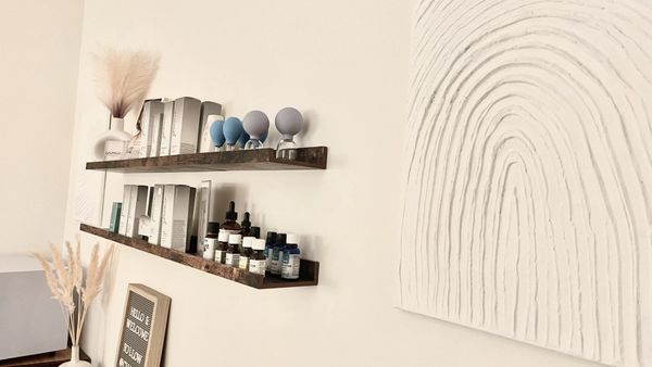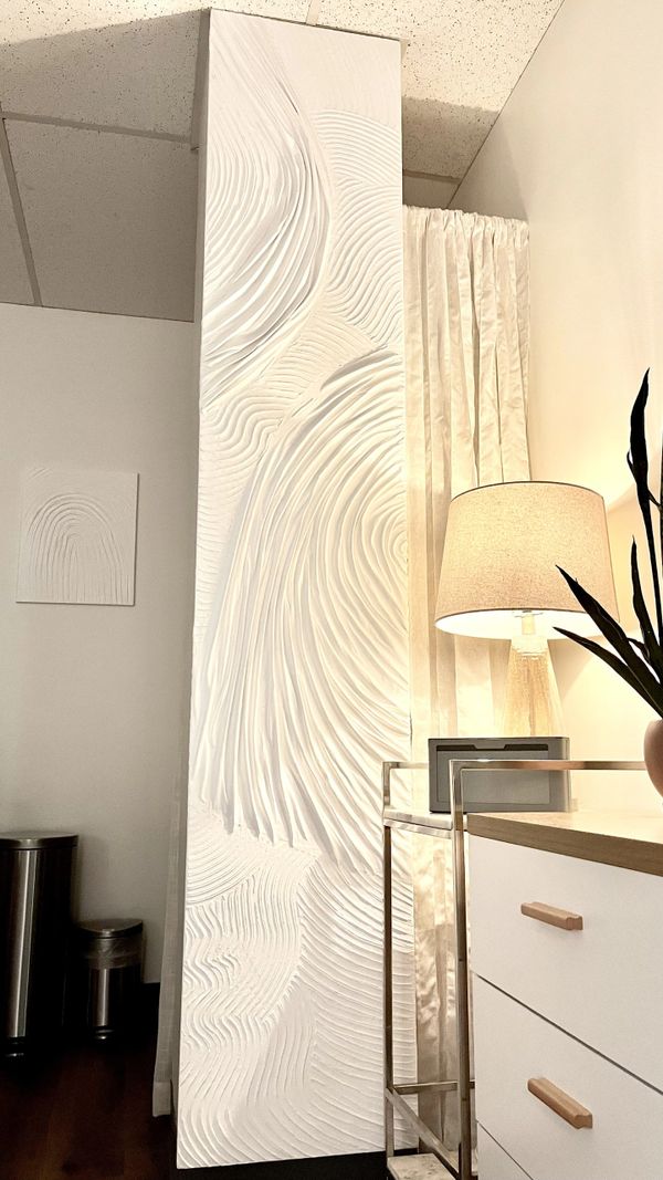 This project was a full redesign of a skincare studio inside a coworking building in Beaverton, OR. I handled layout, lighting, color palette, a mural, and custom artwork to enhance an already warm and welcoming space. The client gave me creative freedom, so I experimented with different layouts and enjoyed making art for this space. A custom 8-foot 3D artwork hangs on a concrete pillar as a focal point, alongside a gallery wall featuring colorful pieces by local artist Sarah Kling (sarahandhareld). This project taught me patience while realizing great design takes time. I had so much fun turning this vision into reality!